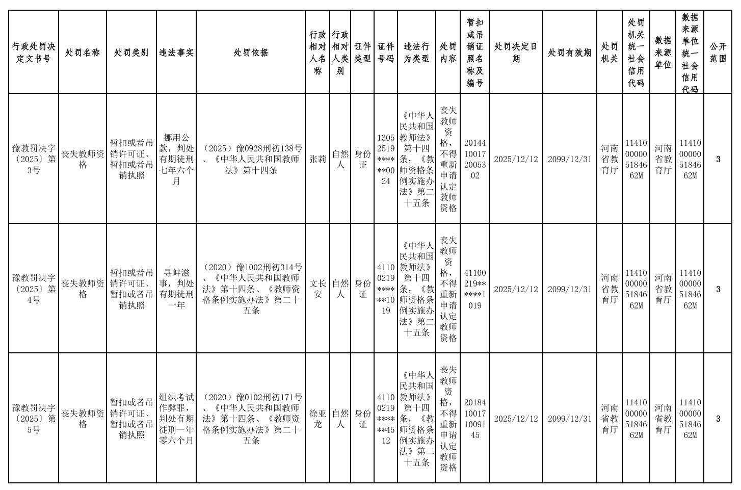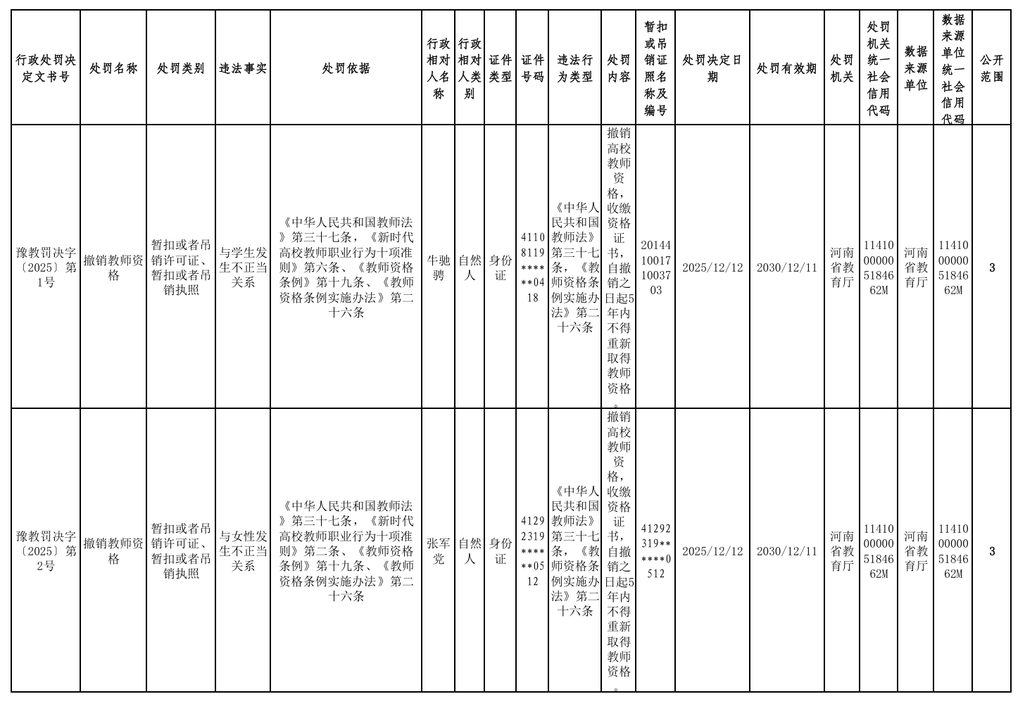 河南省教育厅近日发布《2025年撤销高校教师资格行政处罚》的通报,依法对五名高校教师作出丧失或撤销教师资格的处理。其中,两人因违反师德师风被撤销资格,三人因触犯刑法被剥夺资格。