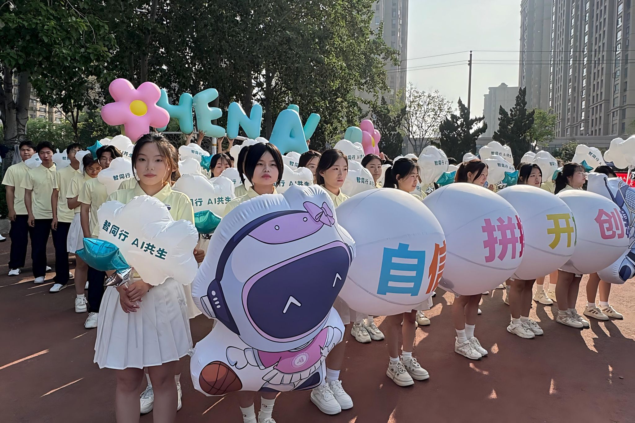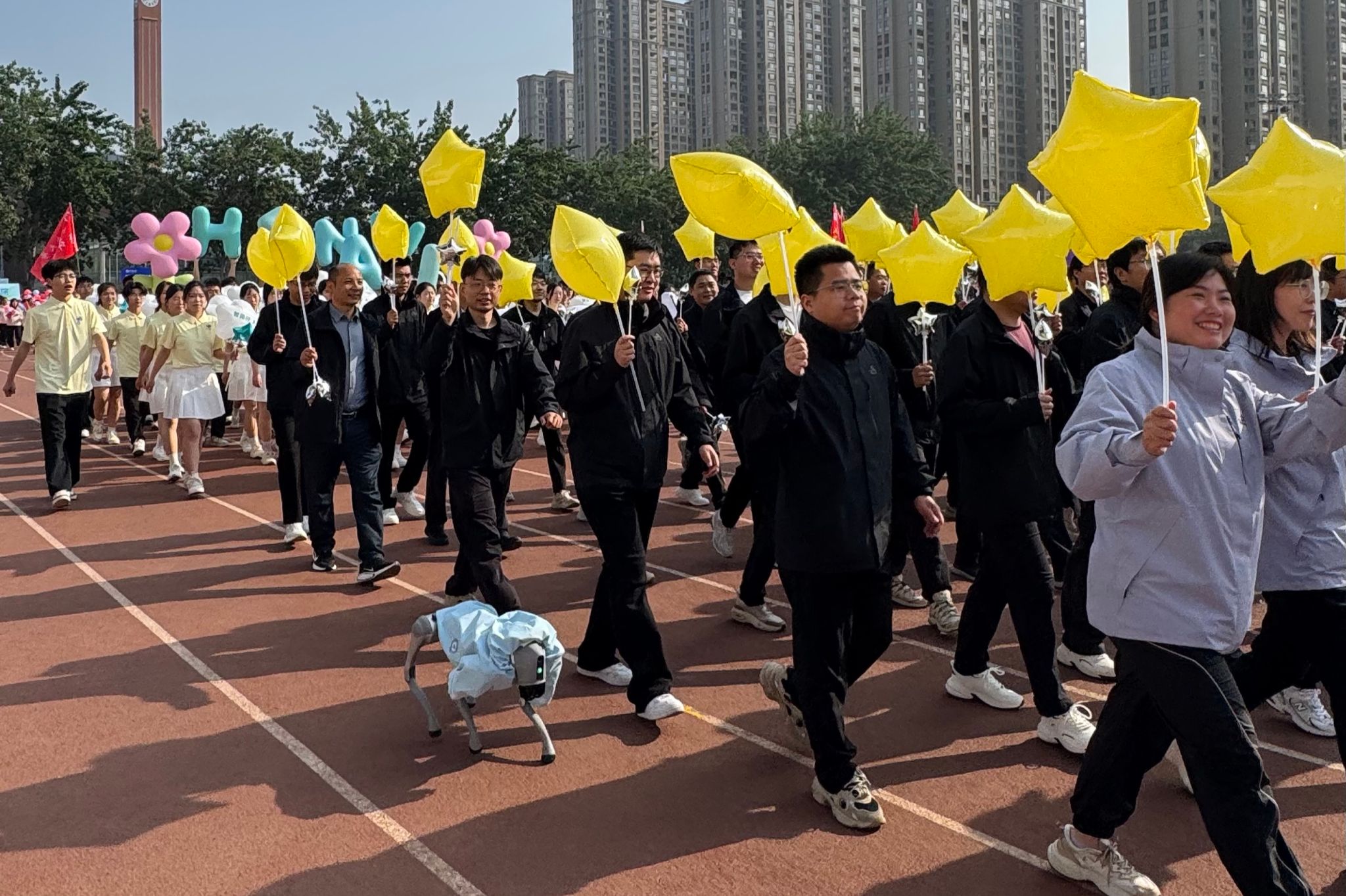 伴着激昂嘹亮的运动员进行曲,学院青年学者石磊教授担任旗手, 2023级本科生人工智能专业班长李书帆担任举牌手,引领方阵阔步向前。学院专属 IP 形象 “河小智”“河小能” 活泼亮相,频频向观众挥手致意、亲切互动;方阵一侧还融入机械狗“河小拓”协同展示,动作整齐、配合默契,实现了科技元素与方阵编排的有机融合。
