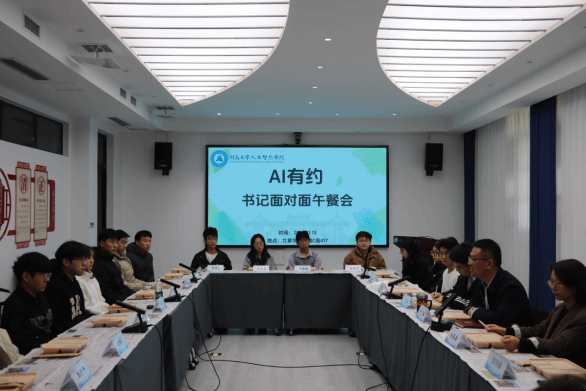11月13日,人工智能学院“AI有约”师生面对面午餐会在郑州校区九章学堂C座417会议室举行。学院党委书记尹猛、党委副书记刘喜英、教师代表、各年级班主任及辅导员与研究生、本科生代表齐聚一堂,围绕学业规划、专业发展和校园生活等议题展开深入交流,倾听学生心声,共绘成长蓝图。